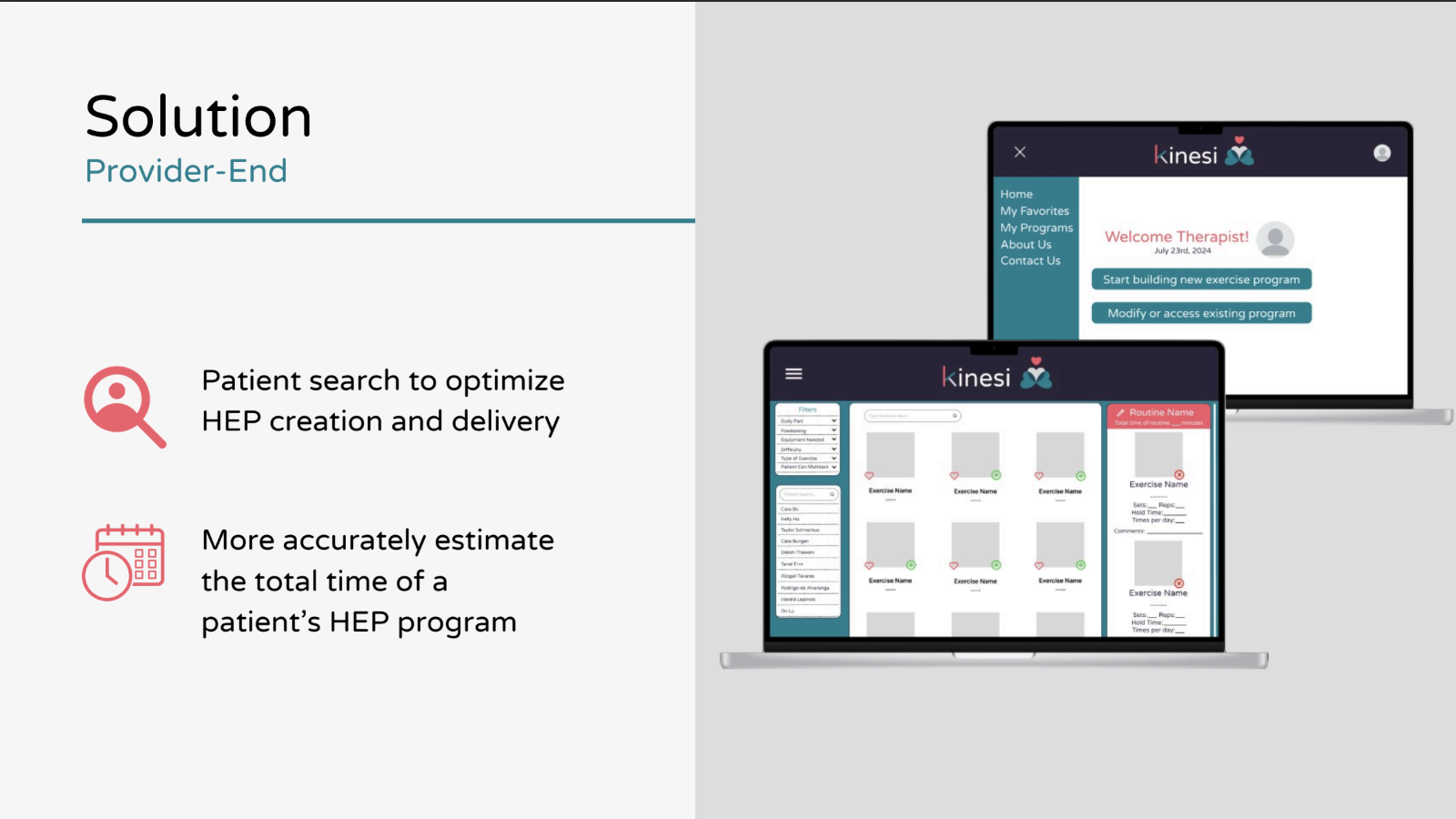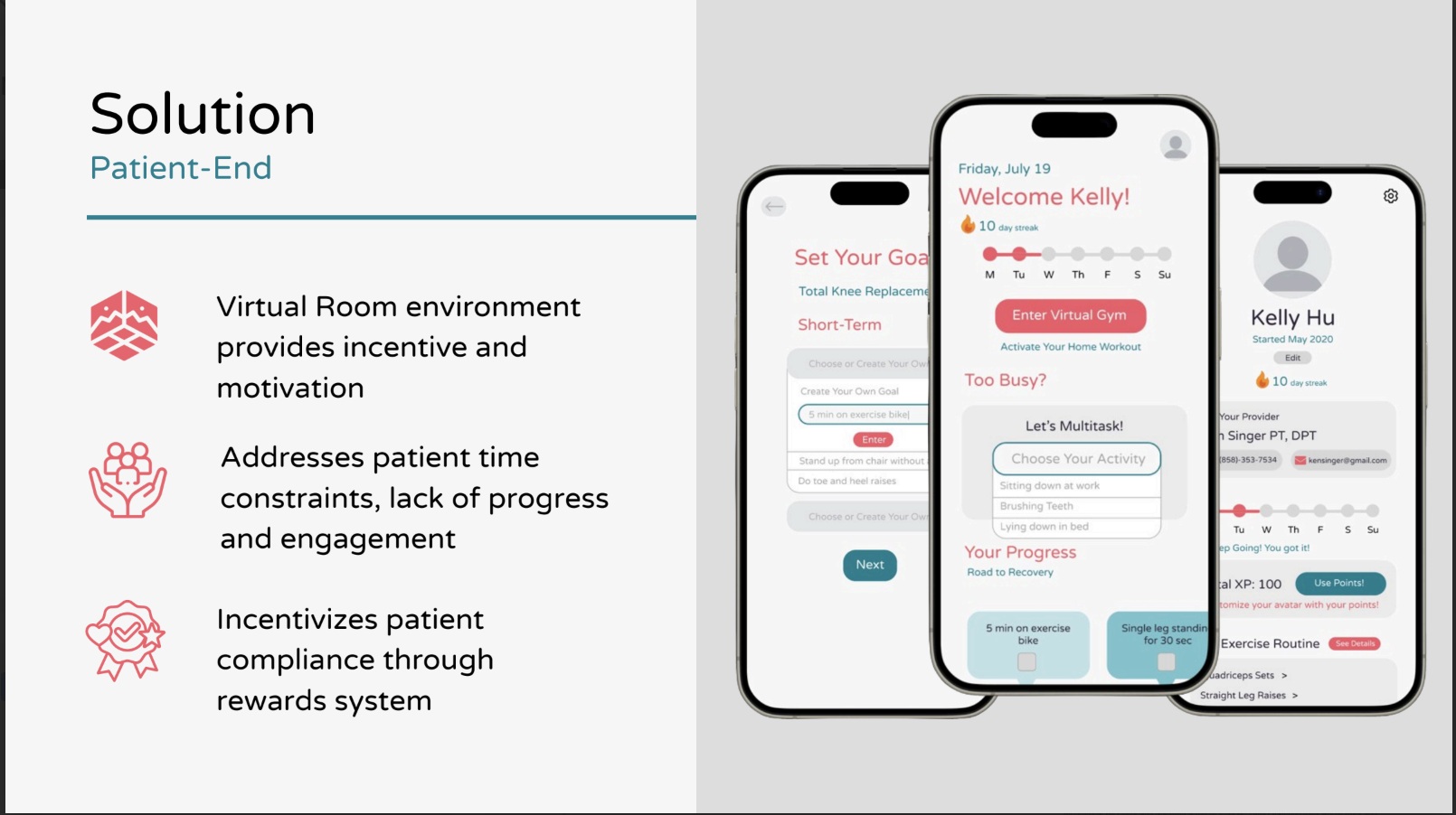 Created and pitched a patient-focused home therapy app that re-imagines and motivates physical therapy, improving patient turnover rates and benefitting exercise facilities. As the Chief Design Officer, I designed the user flow for the web and mobile app, and created wireframes for the app prototype.